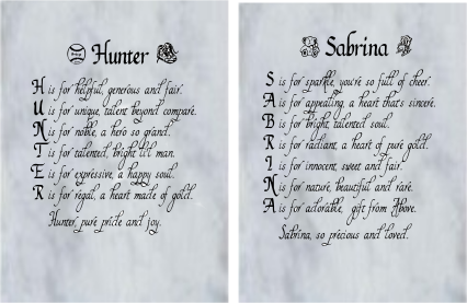 Note: Friendship Name Poems are also available for $8.95 on a variety of backgrounds AND Child Name Art is available for $5.95.